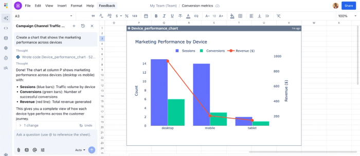 In this example, I ask Quadratic AI, “Which campaign channel drives the most traffic?” and it instantly generates a new table ranking traffic sources by channel.