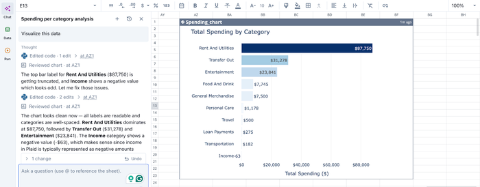 In the image above, I simply ask Quadratic to “Visualize this data”. In seconds, it creates a bar chart that shows the breakdown of total spending by category. Users do not need to specify the chart type, as Quadratic intelligently uses the most appropriate chart type based on your dataset.