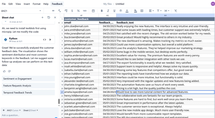 This ability to systematically analyze a spreadsheet for qualitative data alongside quantitative data analysis creates a more comprehensive view of business performance. For example, a product team can know how many customers are using a feature and how they feel about it. A marketing team can identify specific product attributes that drive positive sentiment. By integrating text analysis directly into the spreadsheet environment, these qualitative insights become accessible throughout the organization rather than remaining siloed in specialized text analytics tools.