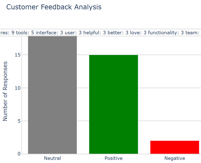 The following images from Quadratic AI show a set of feedback comments from customers, a histogram chart comparing the number of neutral, positive, and negative comments, and the specific feedback related to the product’s features.