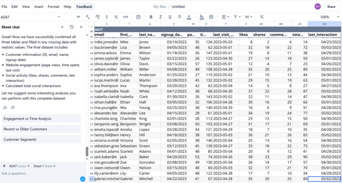 AI tools for data analysis like Quadratic streamline this process through intelligent connectivity. Direct database connections allow you to seamlessly integrate data from PostgreSQL, MySQL, Snowflake, and other sources without leaving your spreadsheet environment for robust database analytics. Rather than writing complex SQL queries for data analysis, you can use natural language to specify the data you need, and the AI model will suggest ideas. The following screenshot shows a combined dataset from three sources with email as the common id. It also shows the chat interface with the AI’s suggestions.
