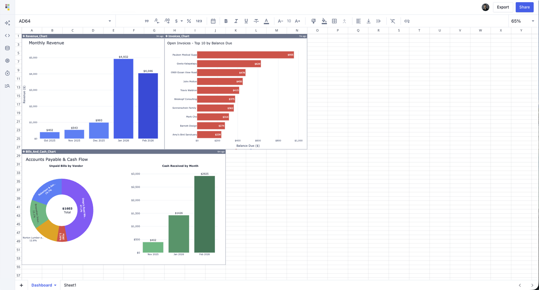 Yes — you can create dashboards for revenue, expenses, cash flow, receivables, and more, all of which can update automatically.