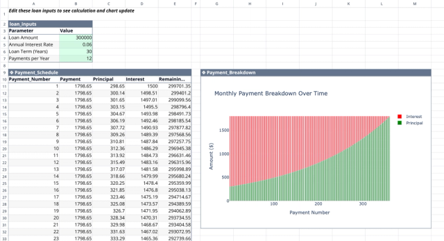 - Shows principal and interest allocation over time