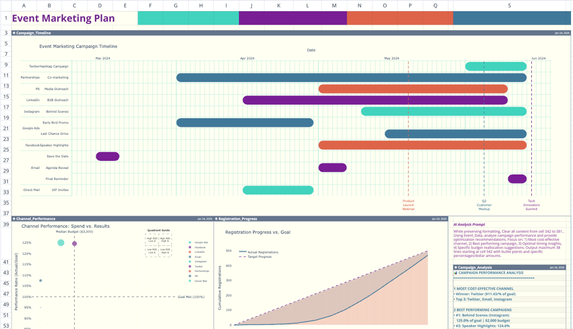 - Centralize event metadata, campaign spend, and operational tasks in one programmable workbook.
