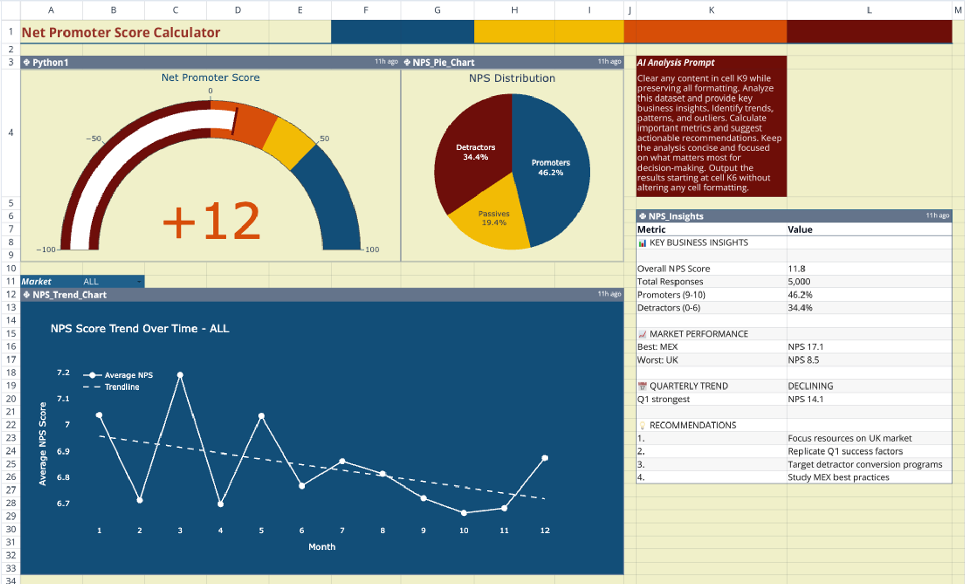 This template centralizes customer survey data into a single analytical view to streamline reporting. By combining Python-based visualization with AI-generated insights, it serves as a dynamic nps calculator for tracking customer sentiment over time. The setup connects raw CSV data directly to interactive dashboards, eliminating the need for complex formulas or manual data manipulation.