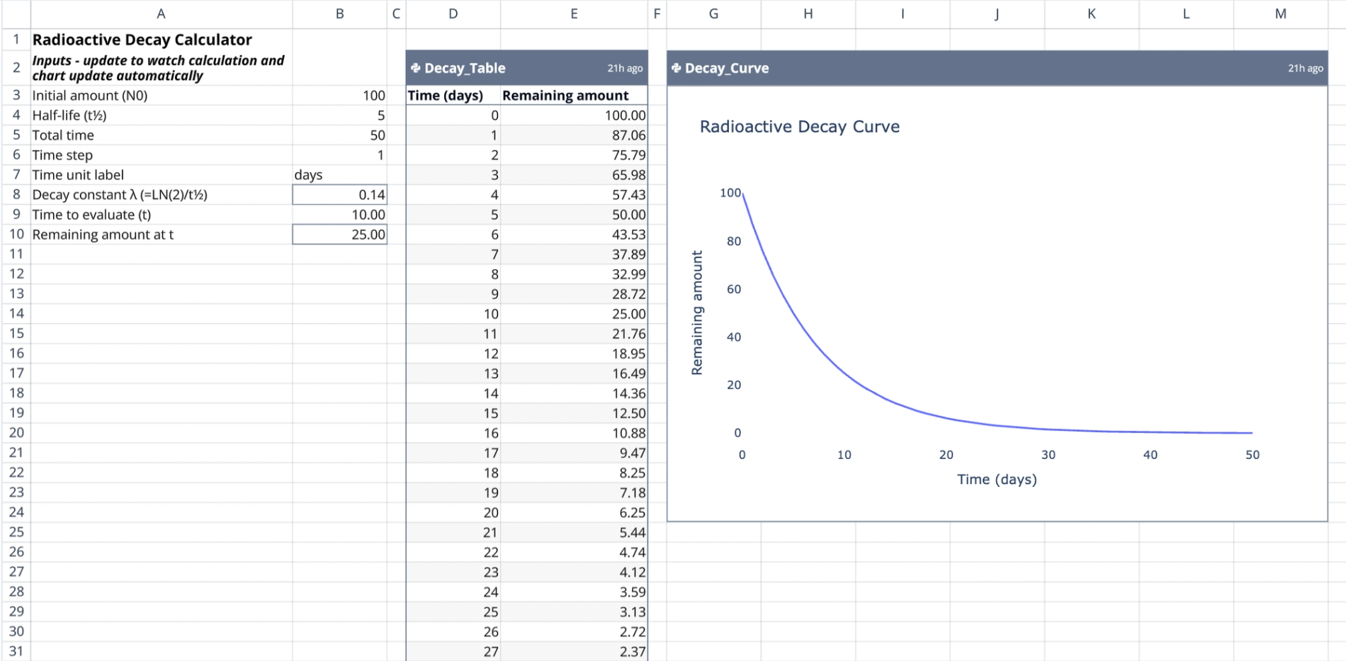 - Reactive updates: When an input changes, the Python cells at D2 and G2 automatically re-execute. The data table and decay curve regenerate instantly to reflect the new parameters.