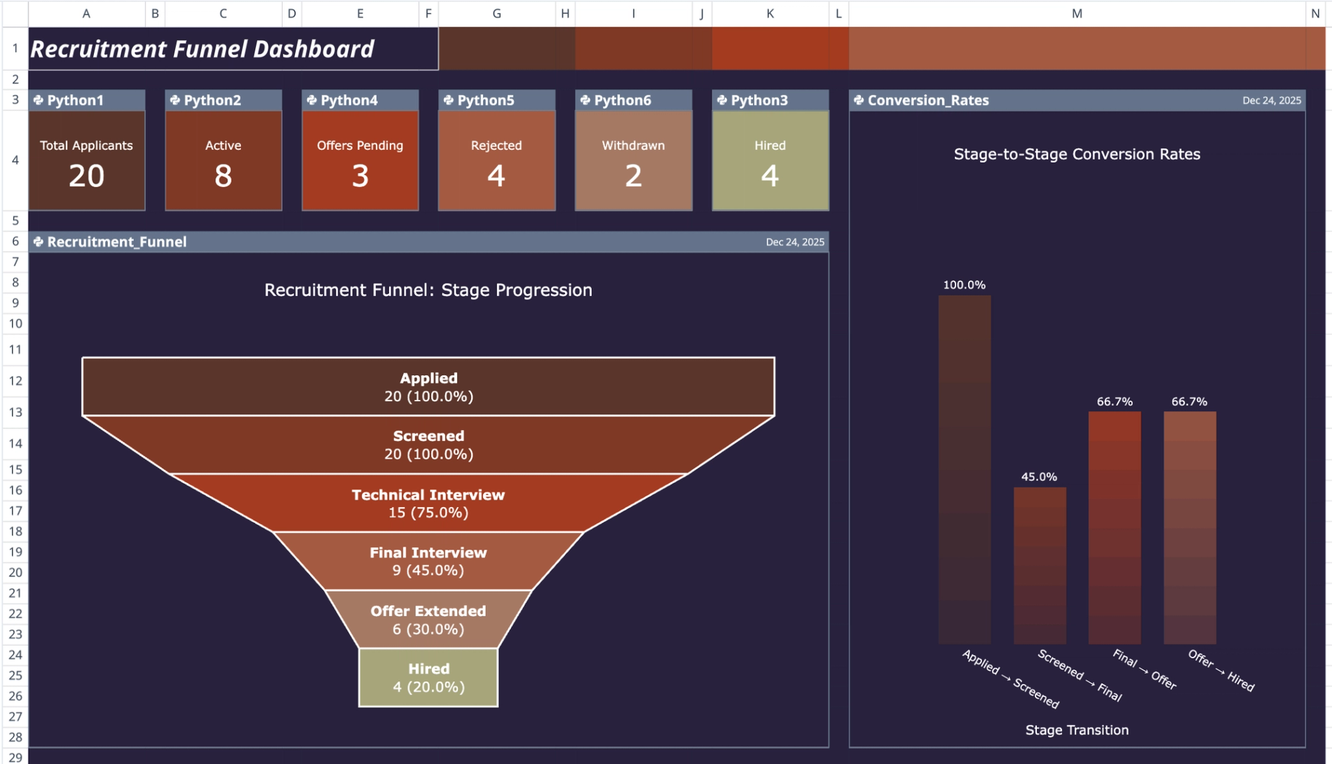 The dashboard integrates Python directly into the grid, functioning as a true python spreadsheet to generate real-time charts and text-based analysis. It tracks critical metrics, including stage conversion rates and source effectiveness, transforming raw applicant logs into clear visual indicators of pipeline health.