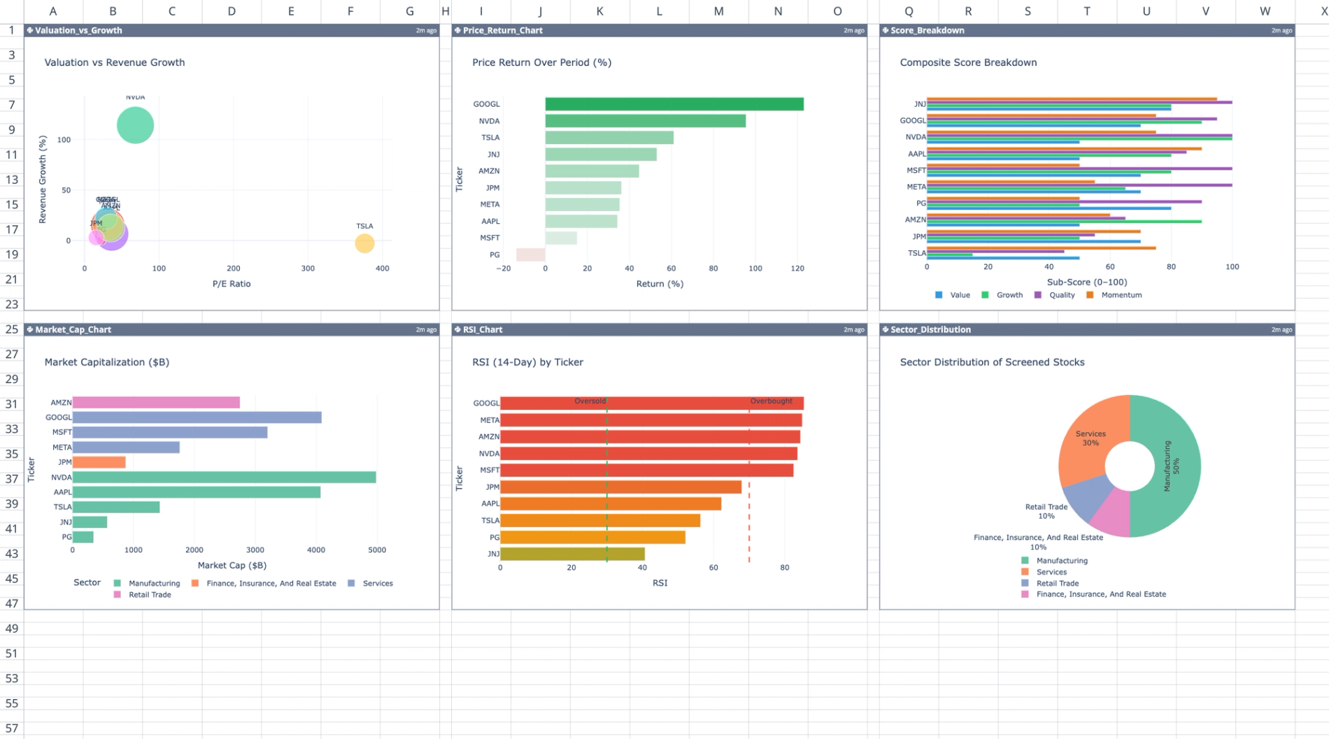 By evaluating these metrics, the template generates a weighted composite score for each stock based on Value, Growth, Quality, and Momentum factors. It also visualizes stock performance, sector distribution, and scoring breakdowns through dynamically generated charts, and produces a text-based summary highlighting top performers, passing strategies, and flagged risks.