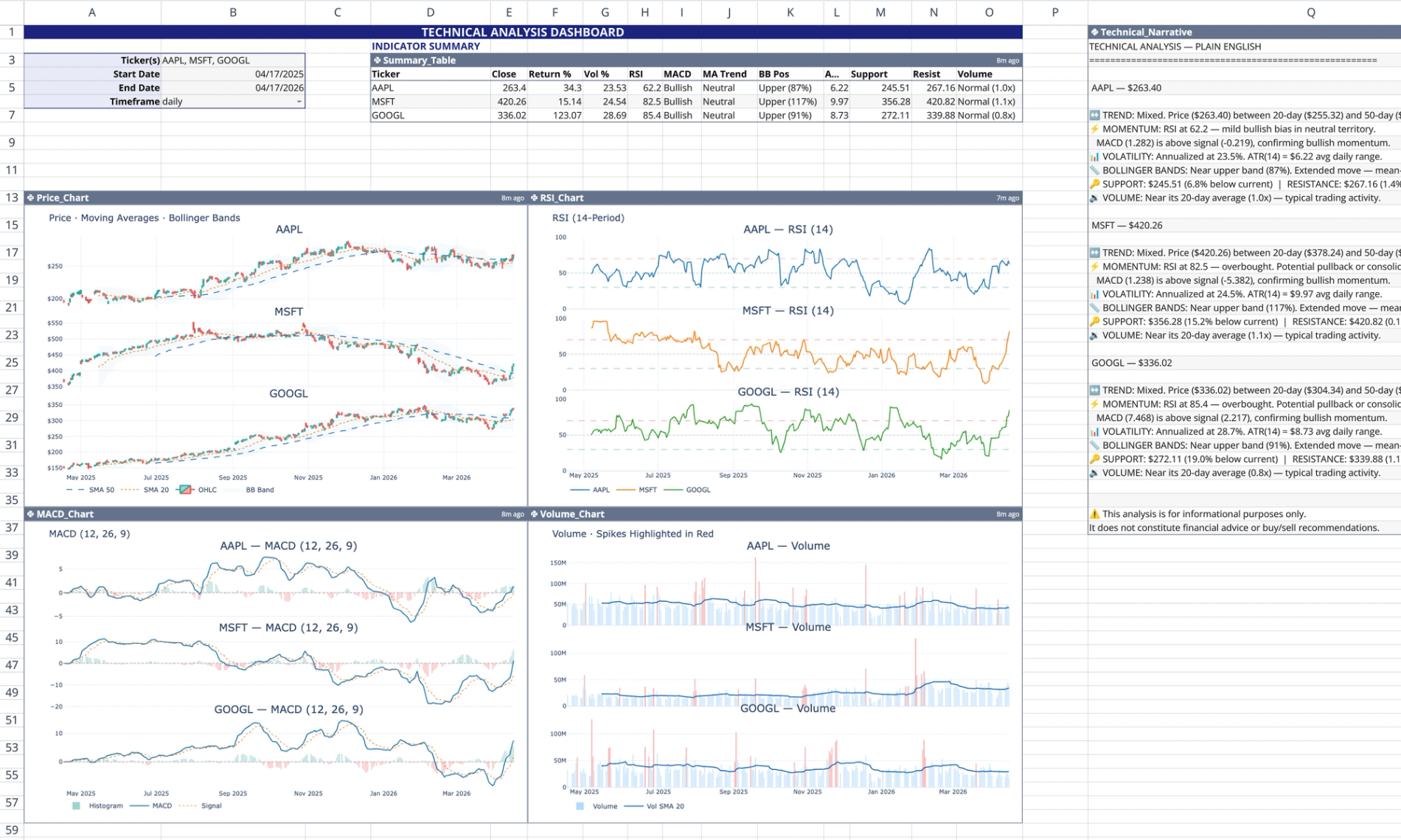 - Technical narrative (Q1): Generates a plain-English, emoji-labeled qualitative summary that interprets trends, momentum, and volume activity for the selected assets.