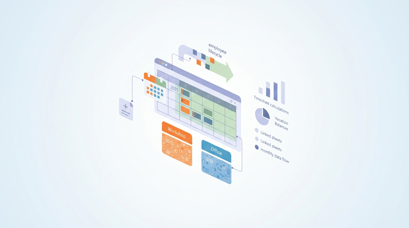 - Manage complex multi-department schedules: Track distinct shift hours and attendance rules for various teams (e.g., workshop vs. office) within a single, visually clear workspace.