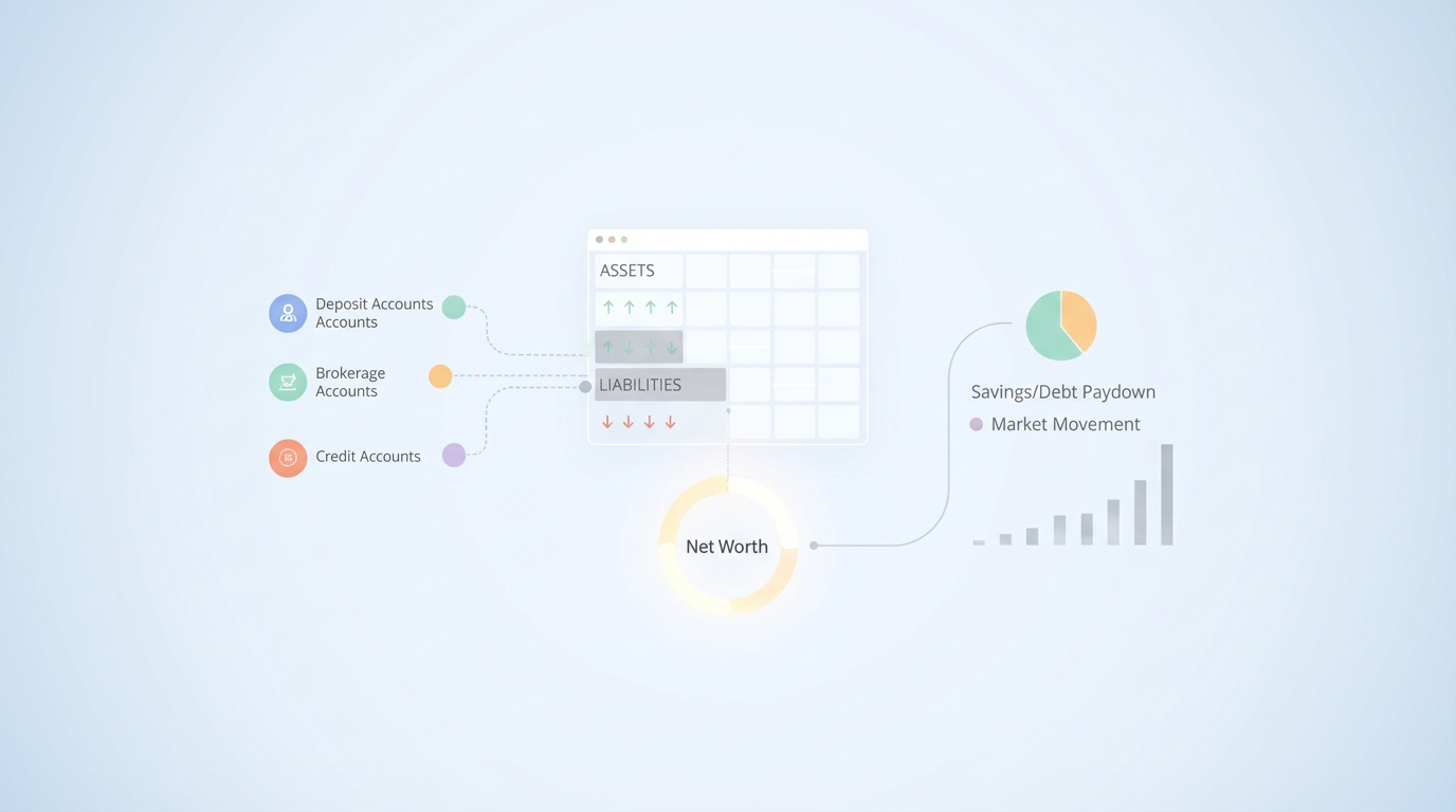 - Understand growth drivers: Perform attribution analysis to clearly see if net worth changes are due to your savings/debt paydown or market movements.